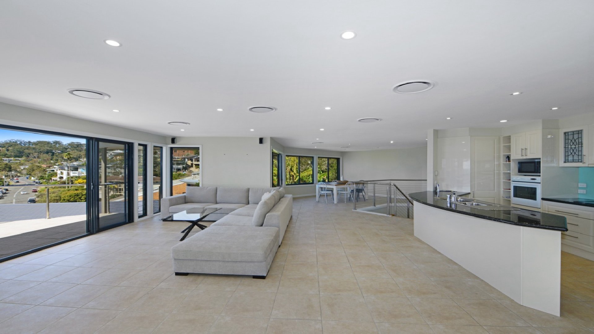 The Upper level has the Main bedroom with views. There is also a bedroom with a Double bed and a bathroom on this level too. Open plan kitchen dining and living area flowing onto the two decks. Downstairs there is another three bedrooms and bathroom.
