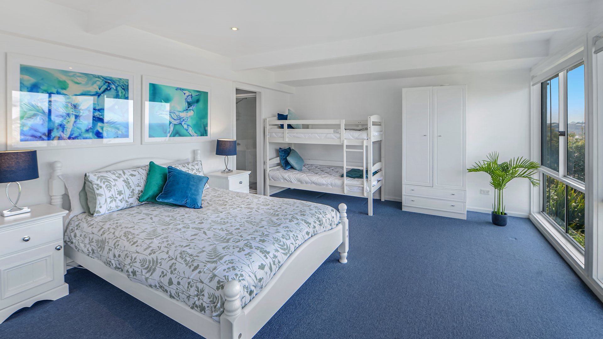 Queen bed plus set of bunks